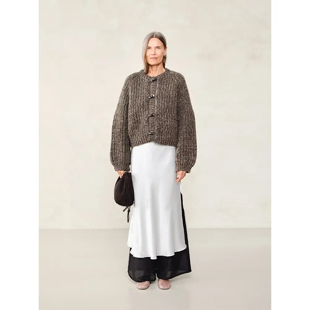 Chunky Jacket aus Fritidsgarn und Kos – eine warme und weiche Jacke im Halbpatent, perfekt als Übergangsjacke an kühlen Tagen. Von oben nach unten mit je einem Faden jeder Qualität gestrickt, mit klassischen Details wie Raglanschrägung und Duffelcoat-Knöpfen. Ein gemütliches Kleidungsstück, das sowohl praktisch als auch stilvoll ist.