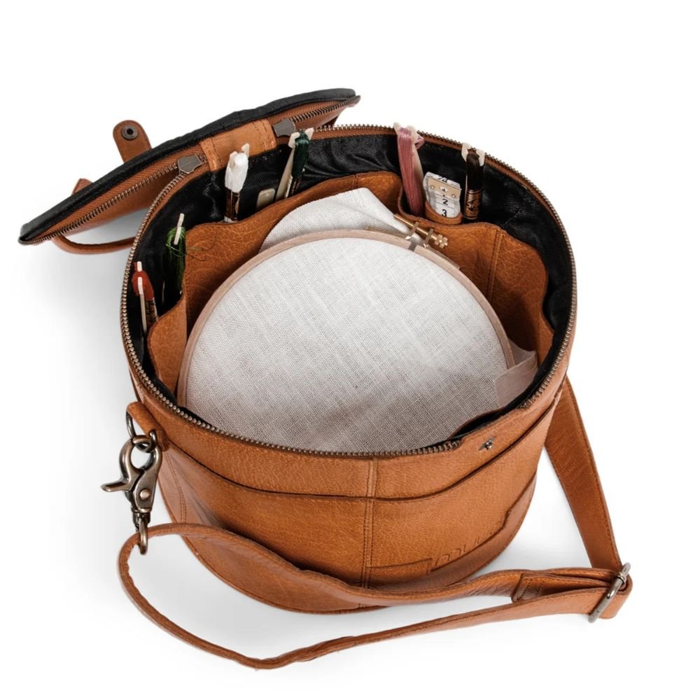 Mit einem Durchmesser von 23 cm hat Enturn Platz für Näh- und Stickrahmen bis 22 cm. Die Enturn Tasche ist sowohl innen als auch außen mit praktischen Fächern ausgestattet, in denen du die meisten deiner Accessoires verstauen kannst – von Stickgarn und -faden bis hin zu Nadeln, Fingerhüten und Scheren.