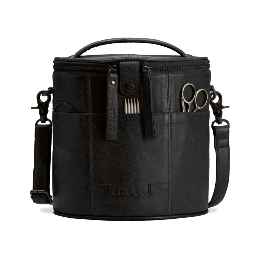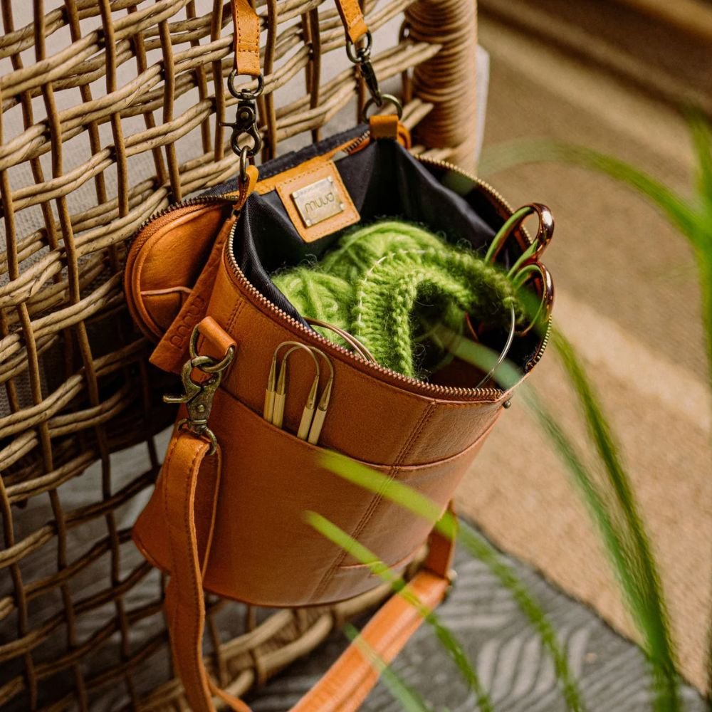 Grace von muud ist eine Projekttasche für Strick und Häkelarbeiten in markanter Halbmondform. Sie lehnt sich natürlich an den Körper, einen Stuhl oder einen Autositz an und bleibt dadurch stabil und nah bei Ihnen, während Sie arbeiten.