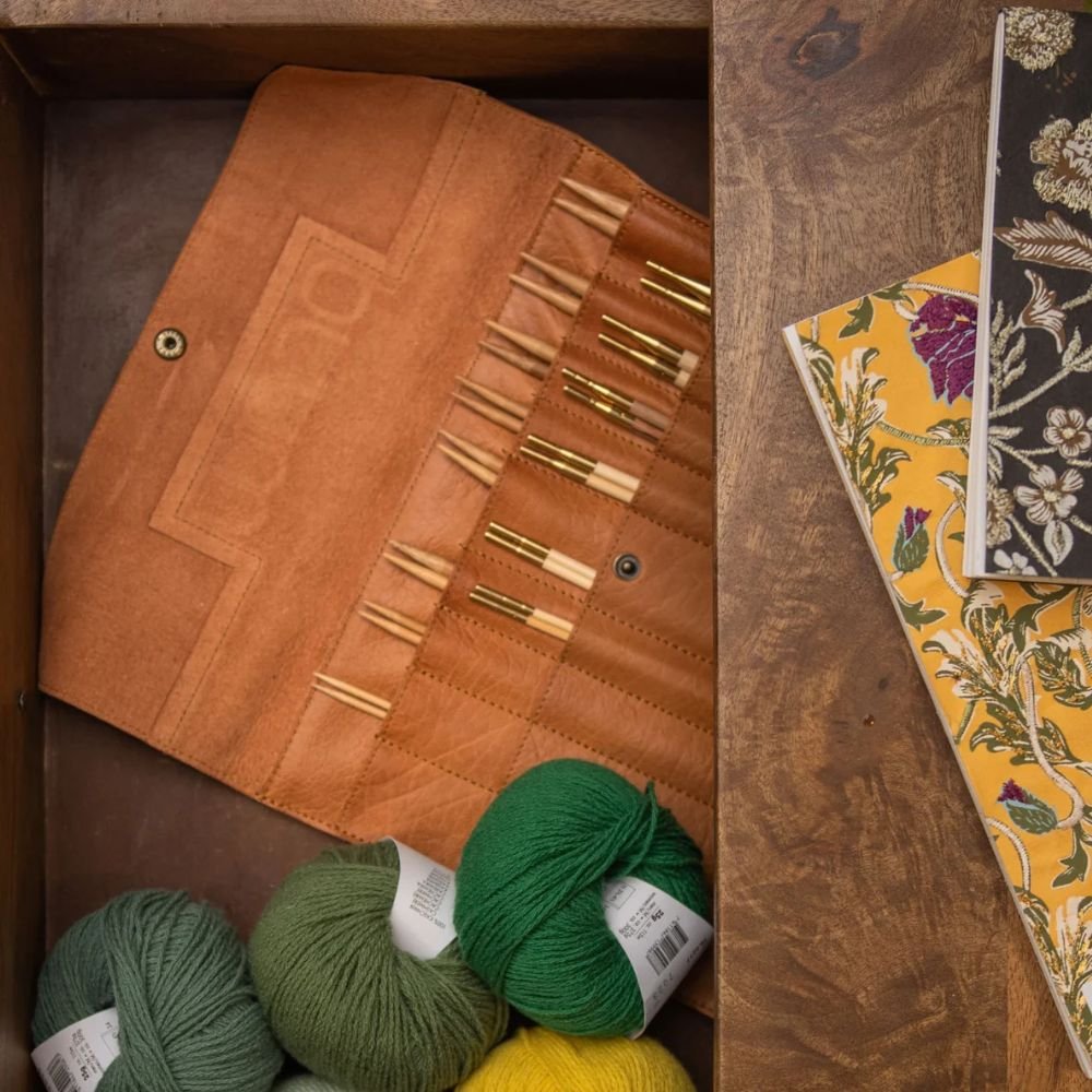 Das edle Nadeletui Oslo XL von muud bewahrt deine Stricknadeln sicher und kompakt auf. Es lässt sich aufklappen, sodass du dir schnell einen Überblick über deine Nadeln verschaffen kannst – sowohl zu Hause als auch unterwegs.