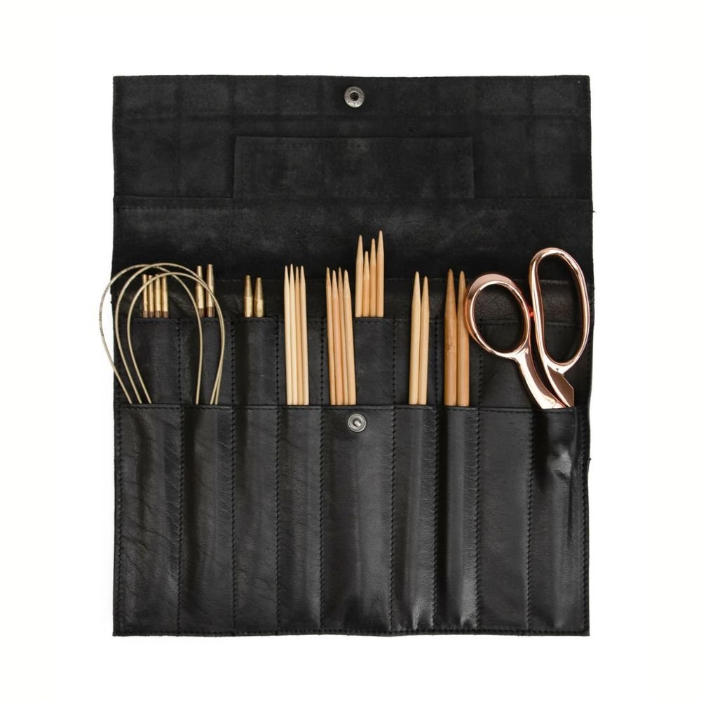 Das große Etui hat 18 Fächer für 18 Nadeln in den Größen 2,5 mm – 5 mm. Es schließt mit einem Druckknopf und ist perfekt für alle, die Wert auf Qualität und gutes Handwerk legen.