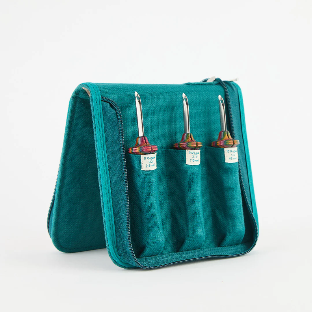 Dieses Set umfasst die drei wichtigsten Nadelgrößen für alle, die gerne mit dickerer Wolle (Rug Yarn) arbeiten und ausdrucksstarke, robuste Texturen schaffen möchten. Kompakt und perfekt organisiert in einem stilvollen Etui.