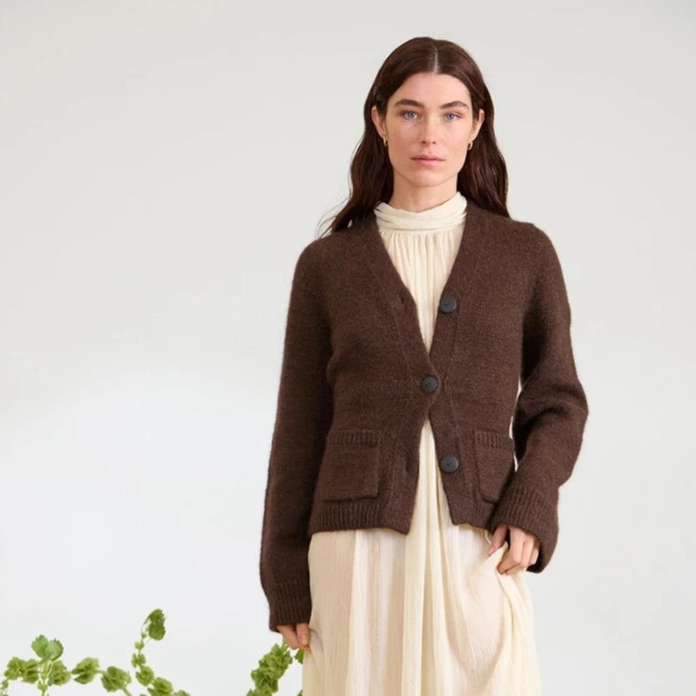 Cardigan von oben nach unten gestrickt mit einem Faden Alpakka Ull und einem Faden Tynn Silk Mohair. Mit V-Ausschnitt, taillierter Form, glatt rechts gestrickten Ärmeln und doppelt gestrickter Vorderkante mit aufgenähten Taschen.